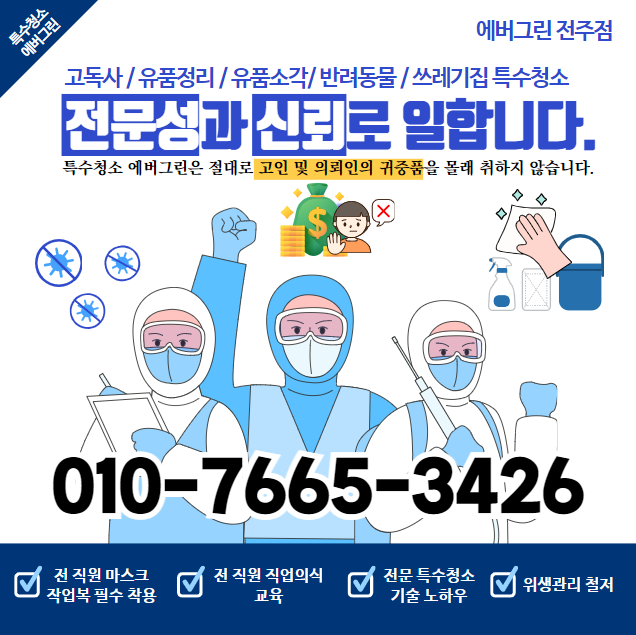 저희 전주 에버그린은 공간을 깨끗이 하는 것을 넘어서, 여러분의 삶의 질을 높이고 새로운 시작을 위한 발판을 마련해 드려요. 지금껏 꿈꿔왔던 깨끗하고 쾌적한 생활 공간을 현실로 만들어보세요. 쓰레기집 문제로 고민하고 계신다면, 주저하지 마시고 전주 에버그린에 연락해주세요. 저희가 여러분의 공간과 삶에 새로운 변화를 가져다 드릴게요.
